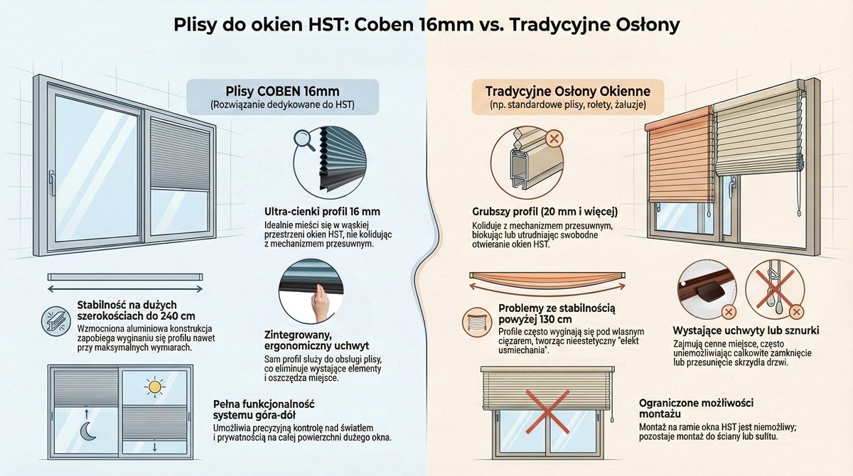 Szerokie okna i drzwi tarasowe HST stwarzają wyzwanie, którym tradycyjne plisy okienne nie zawsze potrafią sprostać. Większość systemów rolet plisowanych może stwarzać pewne problemy już przy szerokościach przekraczających 130 cm - czasem pojawiają się wygięcia profili, problemy ze stabilnością, a także pewne trudności w operowaniu roletą.
